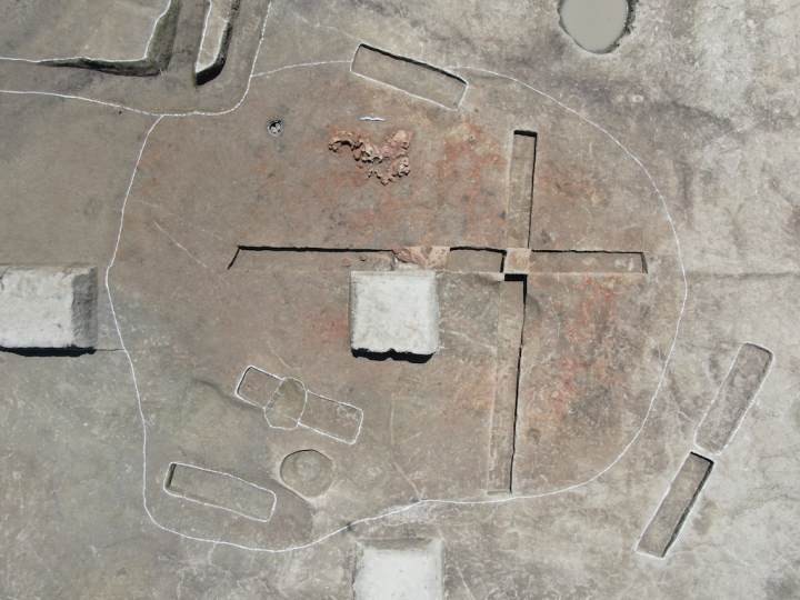 良渚文化晚期遗迹有房址、墓葬、灰坑等。房址为地面式建筑,居住面由黄土铺垫而成,平面形状大致为长方形,柱洞排列没有规律可循。墓葬为土坑竖穴墓,无葬具,南北向,随葬品见有陶鼎、豆、壶、罐和石钺。