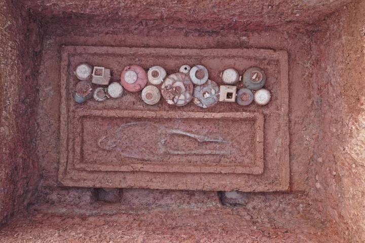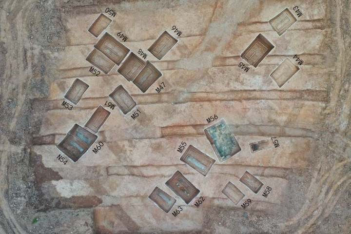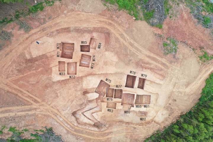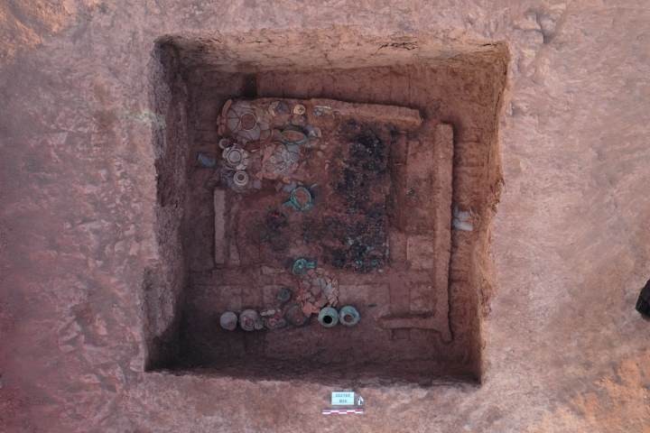 另有少数土坑墓,多位于山顶,平面形状呈正方形或长方形,少数墓葬棺椁痕迹明显,残存人骨,墓底有枕木槽或排水沟,墓外可见由板瓦和鹅卵石筑成的排水沟。随葬品中可见铜釜、铜锺、铜鼎、铜镜、带钩、印章、五铢钱币,硬陶器、铁器及琉璃耳珰等。