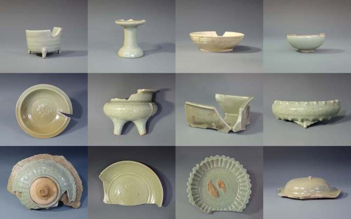 南宋晚期产品数量较少,胎色分为白胎、灰胎、黑胎等,不同胎色产品的器形多有重合,有碗、盘、杯、盏、洗、炉、瓶、盖等二十余种。其中仿古器形的黑胎青瓷较为多见,包括鋬耳杯、觚、贯耳瓶、琮式瓶、鬲式炉、簋式炉,等等。常见窑具有“M”形匣钵、泥质垫饼、小型瓷质垫饼,等等。