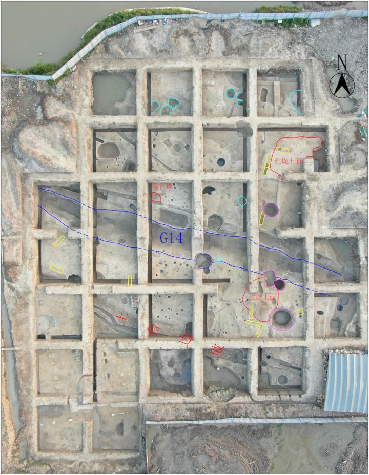 遗址的主体为良渚文化时期的人工堆筑土台,堆积以黄斑土为主,因晚期破坏而分为两个片区,土台分布面积约8000平方米。其中G14从西北-东南方向延伸,贯穿整个遗址,是遗址中良渚文化早期延续至晚期的最重要的遗迹,出土了大量的陶器、石器,少量玉器和动物骨骼。G14两侧发现有多处红烧土面遗迹和良渚时期墓葬共存的遗迹组合,是良渚文化时期基层聚落“居葬合一”的体现。此外,土台边坡发现有集中分布的废弃陶片堆积,土台上有不同时期的活动面,出土了大量陶器和石器。同时遗址内春秋战国至明清时期人类活动频繁,对良渚文化时期土台造成较严重的破坏,也发现了大量历史时期的遗迹和遗物。