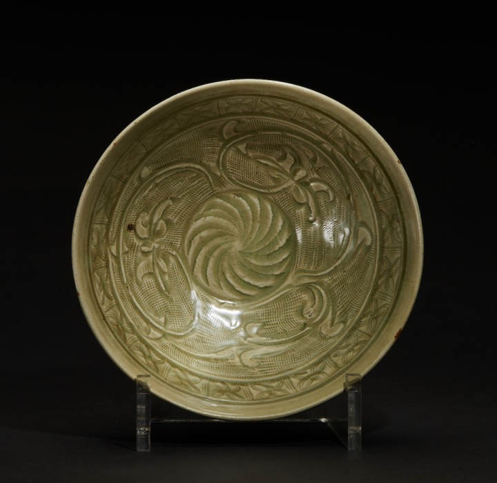北宋晚期龙泉窑青釉篦划莲花折扇纹瓷碗