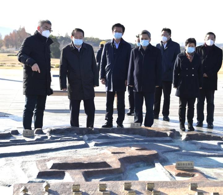 12月18日,省委书记易炼红在良渚古城遗址公园,考察莫角山遗址和反山王陵遗址,了解良渚文化保护利用传承工作。浙江新闻客户端记者 梁臻 摄