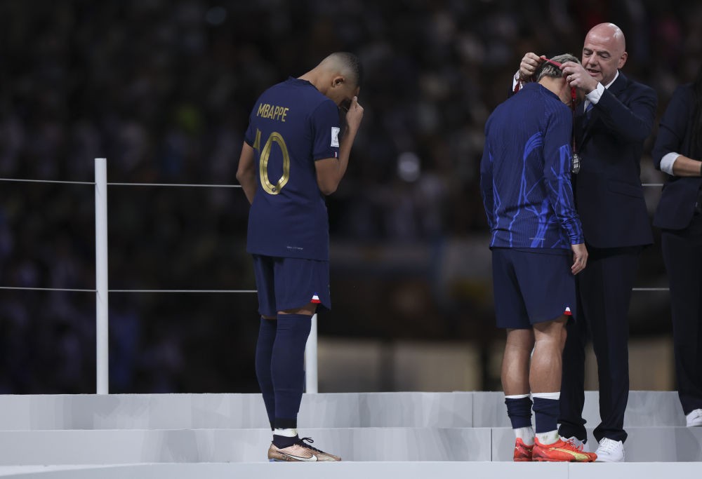12月18日,法国队球员姆巴佩(左)在颁奖仪式上。新华社记者 李明 摄