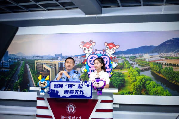 温州茶山派出所民警刘昱洲在温州医科大学与大学生一起进行反诈宣传直播。温州市公安局供图
