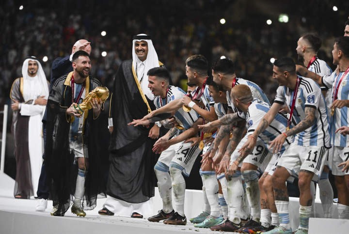 12月18日,阿根廷队球员梅西(左二,前)在颁奖仪式上手捧大力神杯准备与队友庆祝。新华社记者 李尕 摄