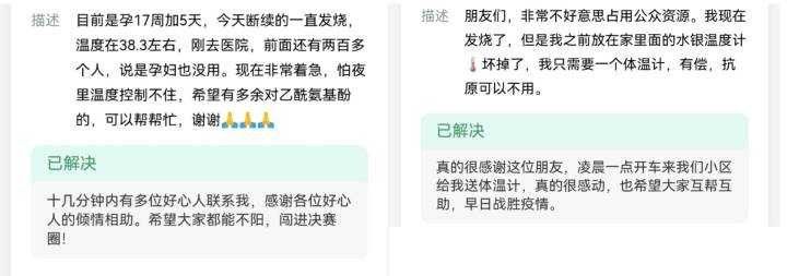 守望相助,共克时艰。平台上,许多求助逐渐转为“已解决”状态。