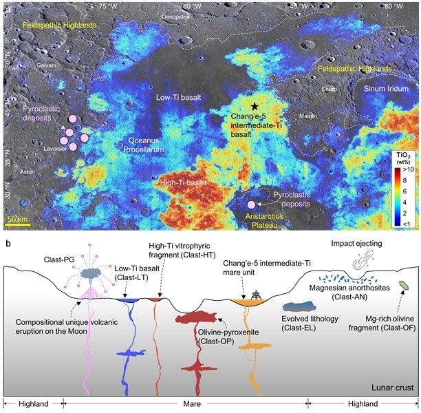 中国科学院地球化学研究所科研团队通过分析超过3000颗嫦娥五号月壤颗粒,识别出7颗不同于嫦娥五号中钛玄武岩的火成岩碎屑,包括:高钛玻基斑状岩石碎屑、低钛玄武岩碎屑,橄榄辉石岩碎屑、镁质斜长岩碎屑、高度演化岩石碎屑、富镁橄榄石碎屑和火山玻璃碎屑。
