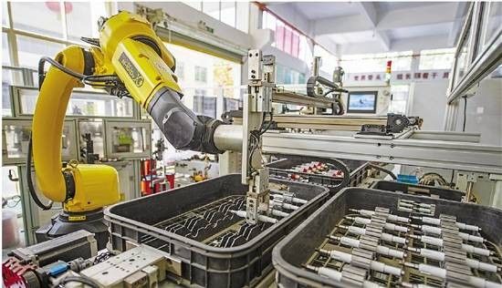 在永康市一企业自动生产线上,机器人手臂进行智能化生产。新华社发