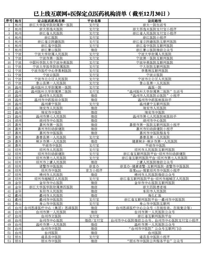 截至12月30日,浙江共有53家医院开通“互联网+医保”诊疗服务,患者可通过支付宝、微信两个平台登录互联网医院就诊。
