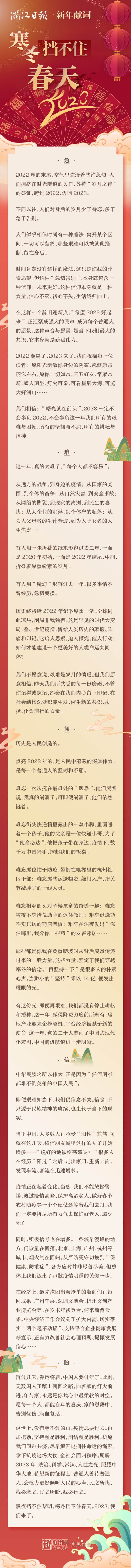 2022翻篇了,2023来了。我们祝福每一位读者:愿阳光驱散你身边的阴霾,愿健康常随你左右,愿你一切如常,三五好友、常聚常新,家人闲坐、灯火可亲,可看星辰大海、可览大好河山……