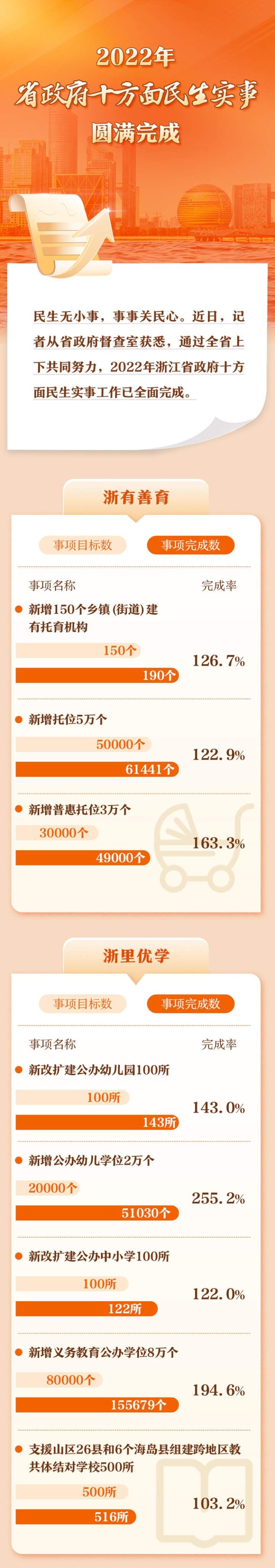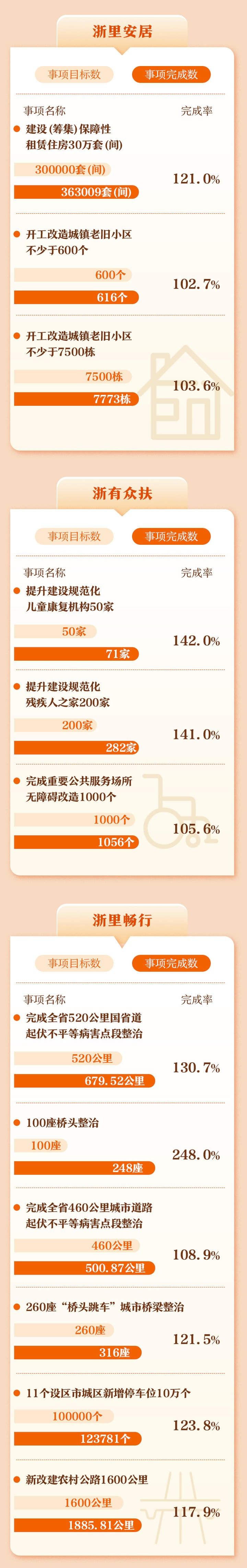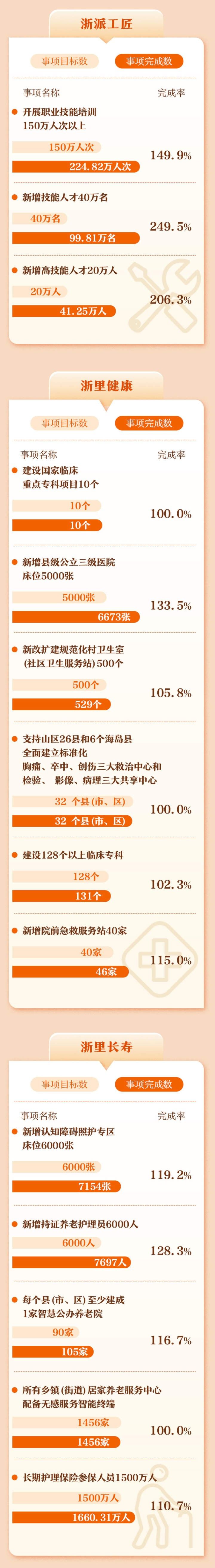 记者细细翻阅2022年省政府十方面民生实事“年终成绩单”,发现不仅既定项目已全部完成,超指标任务完成的民生项目更是比比皆是——“浙里优学”中,目标新增义务教育公办学位8万个,实际新增超15万个,完成率达194.6%;“浙派工匠”中,目标新增高技能人才20万人,实际新增41.25万人,完成率206.3%;“浙里长寿”中,目标新增持证养老护理员6000人,实际新增7697人,完成率128.3%……