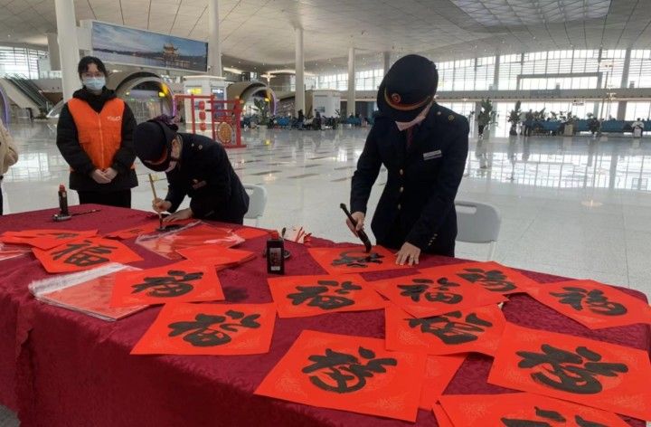 此外,近期杭州西站还有各式暖心服务,如书法爱好者现场写春联、送福字,让旅客把“福”带回家;元宵节时,西站还将组织旅客开展猜灯谜活动,并设置思念寄语墙,欢迎旅客返杭,不要错过哦!