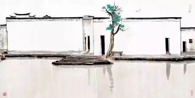 乌黑的瓦、洁白的墙、苍劲挺拔的老树、飞舞灵动的燕子......水墨画《双燕》,以江南水乡为题材,在真实的景致中高度提炼意象特点,其灵感来源于画家吴冠中在宁波火车站候车时的匆匆一瞥,简洁的线条、大块的留白,令白墙黛瓦、燕雀飞舞的江南情致跃然纸上。