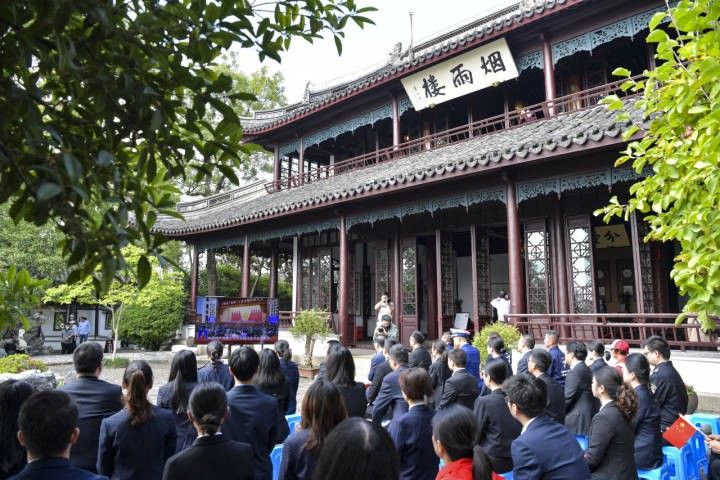 2022年10月16日上午,嘉兴市部分党员干部群众在烟雨楼前认真收看党的二十大开幕会直播。