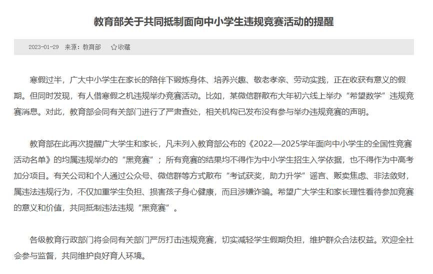 有人借寒假违规举办竞赛活动,教育部提醒:凡未列入教育部《2022—2025学年面向中小学生的全国性竞赛活动名单》的均属违规举办的“黑竞赛”;所有竞赛结果均不得作为中小学生招生入学依据,也不得作为中高考加分项目。中小学生可以参加哪些全国性竞赛?戳图↓↓