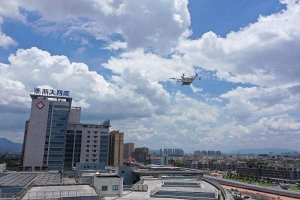 浙大四院开辟的浙中首条5G医疗无人机运输航线,无人机往返于总院和医共体院区之间。图片由浙大四院提供