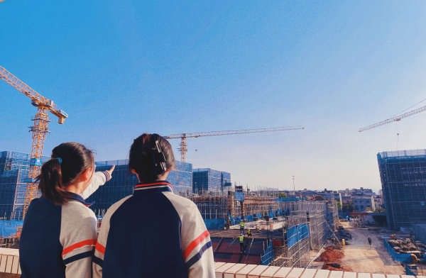 龙游中学,学生们正在看即将建成的校园新项目。龙游中学 供图