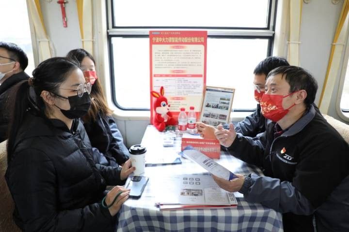 为招聘到人才,宁波中大力德智能传动股份有限公司还打出了公司的“明星牌”——全国劳模、公司设备科科长万亚勇。“我们公司已经连续三年参与列车招聘会,今年我们侧重于招聘储备干部,提供了200余个岗位,成长前景广阔。”万亚勇介绍道。
