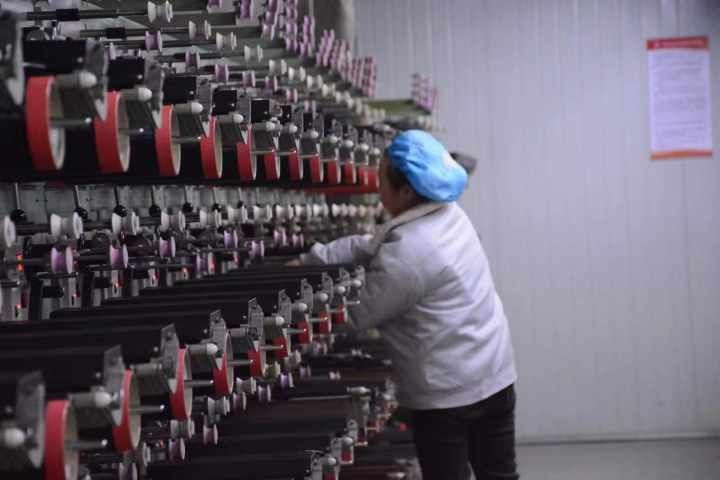 浙江千禧龙纤特种纤维股份有限公司生产车间内,工人在整理线筒。