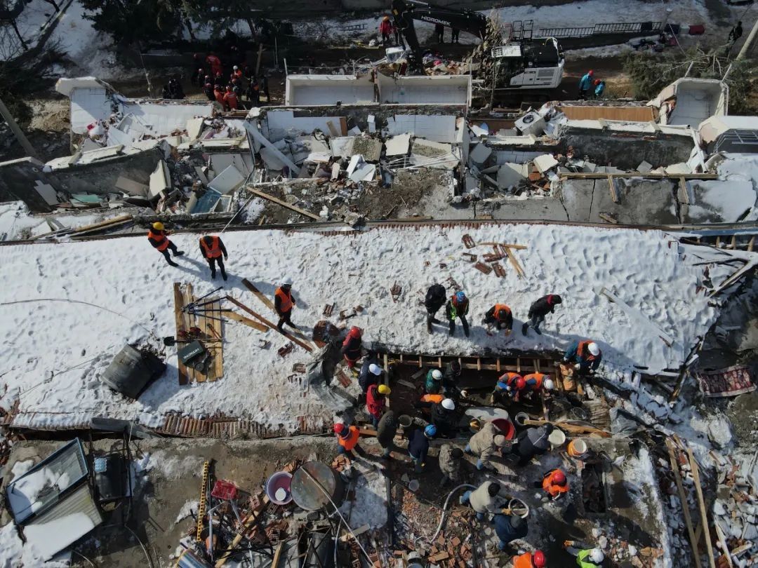 2月8日,在土耳其阿德亚曼省贝斯尼,救援人员在地震废墟搜救 图源:新华社