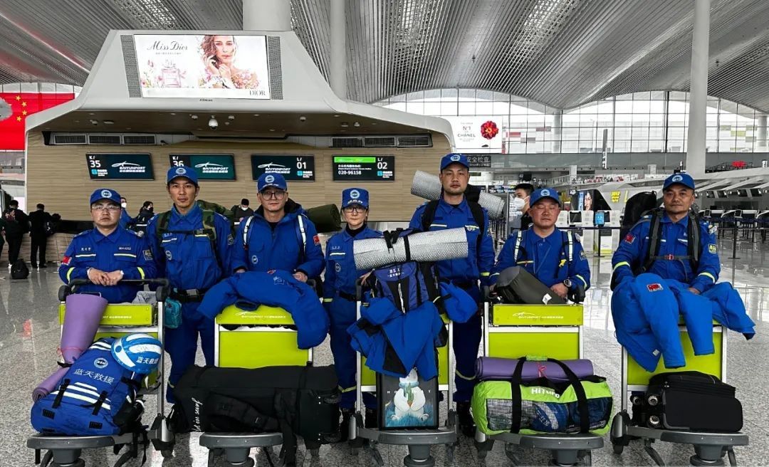 2月8日,广州白云机场,杭州萧山蓝天救援队3名队员与宁波蓝天救援队4名队员集结完毕,出发赴土耳其参加国际救援任务