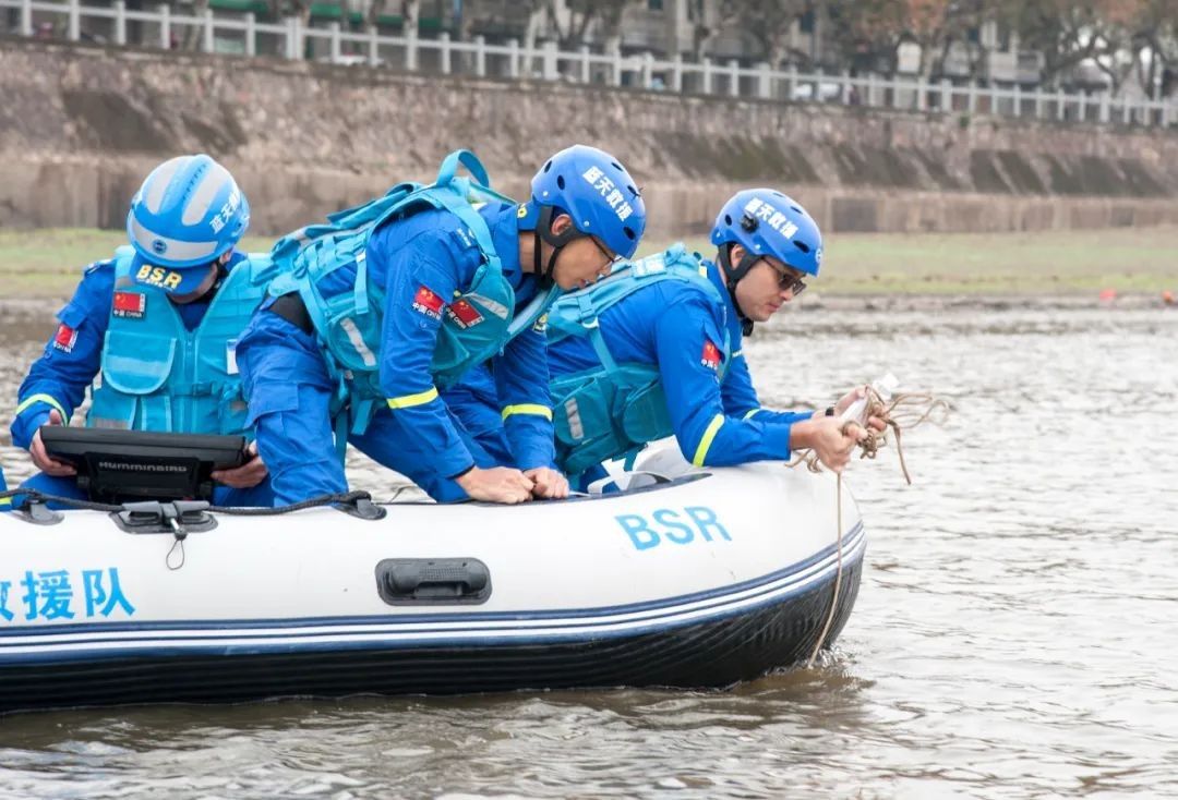 金华蓝天救援队队员正练习使用声呐探测仪实施水域救援训练