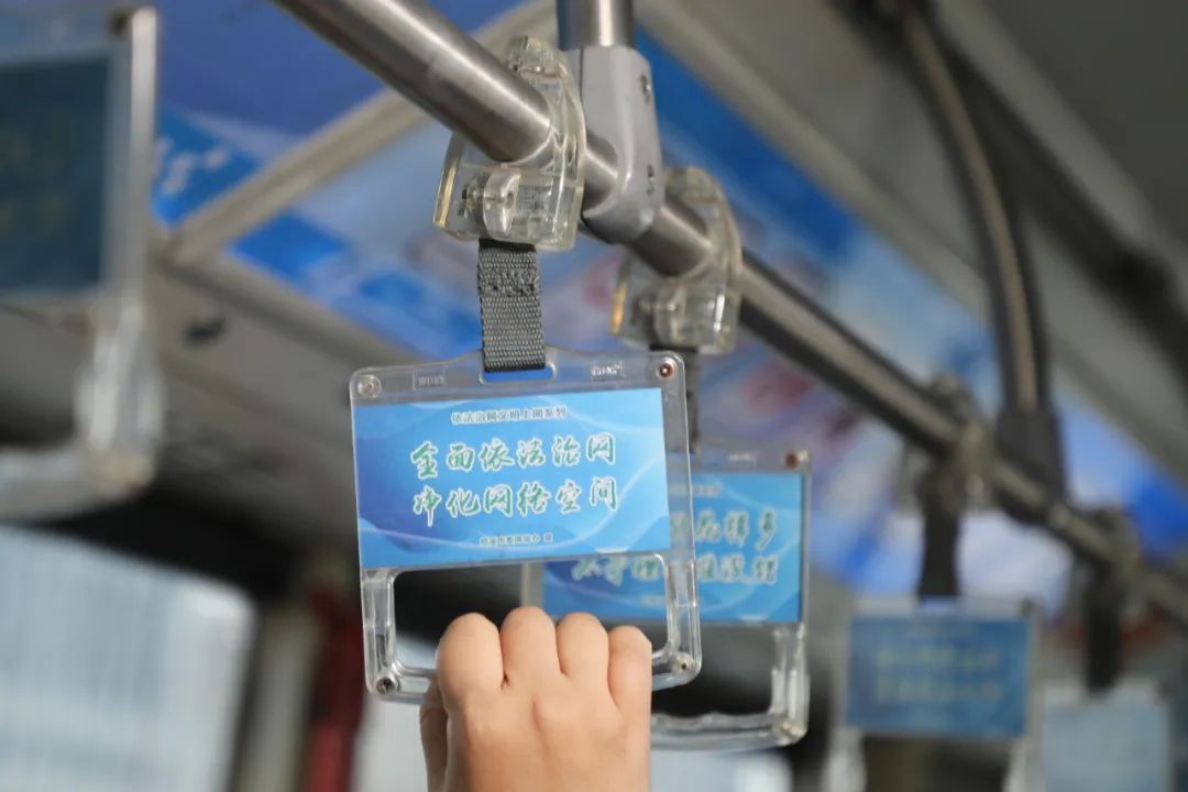 车厢内,把手上也印刷着网络普法相关小知识,从网络法律知多少系列到网络电信防诈骗系列再到依法治网文明上网系列,一条条简洁明了的小标语,大力宣传重点网络普法内容。