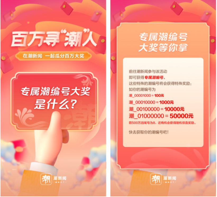活动期间,每位登录客户端的用户,将自动获得专属“潮”编号。凭着这个独一无二的密码,与潮新闻最有缘的你,将有机会“解锁”最高5万元的大奖!