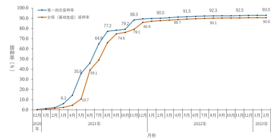 截至2023年2月16日,31个省(自治区、直辖市)和新疆生产建设兵团累计完成接种新冠病毒疫苗349177.5万剂次(图5-1)。接种总人数131036.1万人,完成全程接种127685.8万人,完成第一剂次加强免疫接种82710.2万人。全人群第一剂次、全程接种覆盖比例分别达到93.0%和90.6%(图5-2)。60岁以上老年人累计报告接种新冠病毒疫苗67949.0万剂次,接种总人数24167.3万人,完成全程接种23028.0万人,完成第一剂次加强免疫接种19266.9万人。