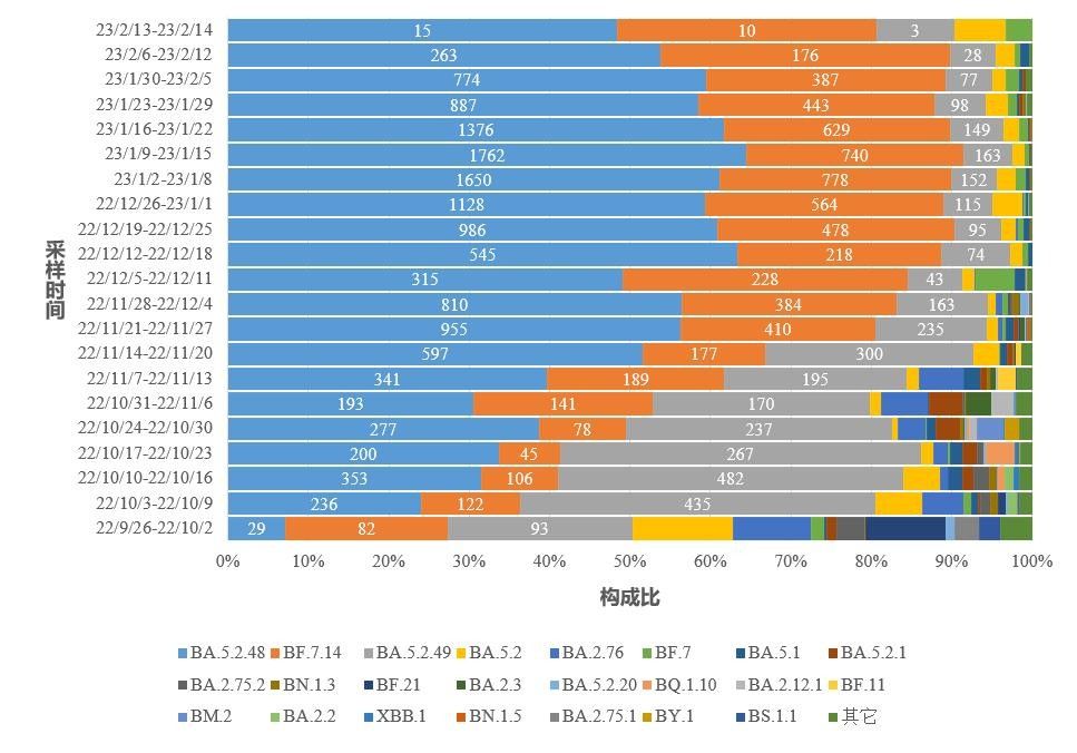 2.图中标记的数字分别为BA.5.2.48、BF.7.14和BA.5.2.49进化分支有效基因组序列数量。