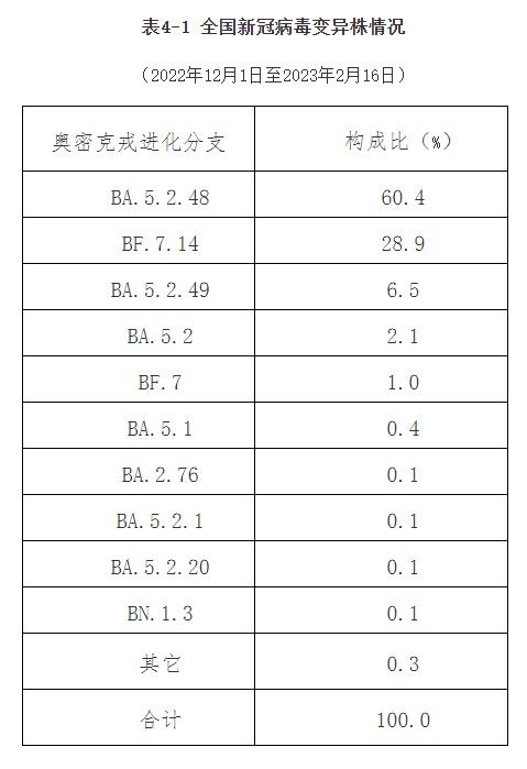 (二)12月以来本土病例病毒变异株监测情况。2022年12月1日至2023年2月16日,全国共报送16931例本土病例新冠病毒基因组有效序列,全部为奥密克戎变异株,共存在34个进化分支。主要流行株为BA.5.2.48(60.4%)和BF.7.14(28.9%)(表4-1)。共发现本土重点关注变异株15例,其中,1例XBB.1,1例XBB.1.5,1例BQ.1,5例BQ.1.1,1例BQ.1.1.17,4例BQ.1.2和2例BQ.1.8。