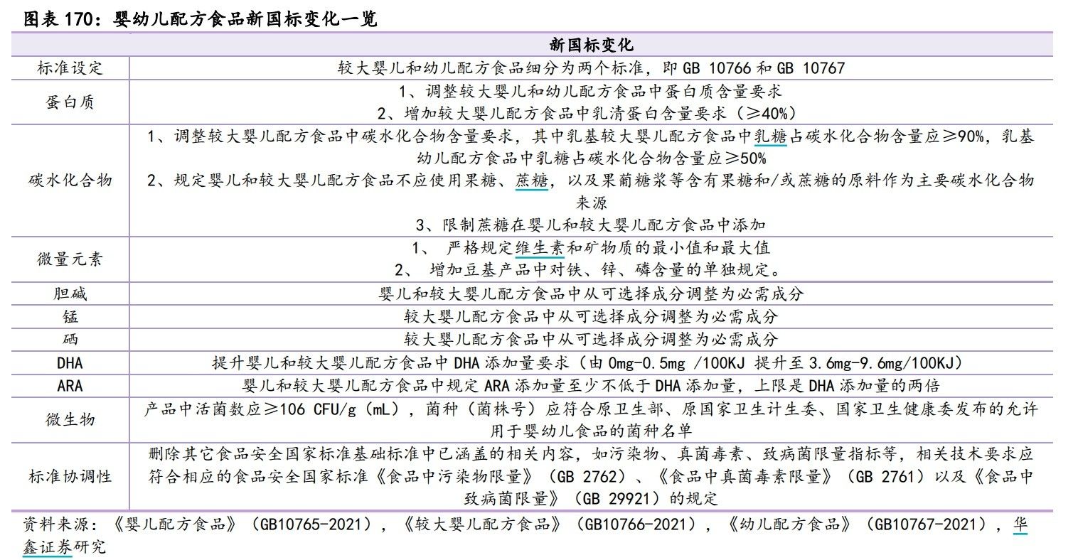 《婴幼儿配方食品系列标准问答》显示,根据最新的科学证据,参考国际标准的修订趋势,结合我国婴幼儿的营养素需要量,对宏量营养素进行修订:一是调整了较大婴儿和幼儿配方食品中蛋白质含量要求,并增加了较大婴儿配方食品中乳清蛋白含量要求;二是调整了较大婴儿配方食品中碳水化合物含量要求,与婴儿配方食品要求一致;三是增加了较大婴儿和幼儿配方食品中乳糖含量要求,并明确限制蔗糖在婴儿和较大婴儿配方食品中添加。