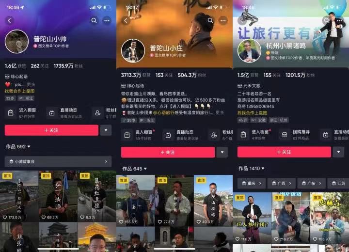其中来自舟山市的导游主播@普陀山小帅(抖音粉丝超1625万)和@普陀山小庄(抖音粉丝超489万),来自杭州的导游主播@杭州小黑诸鸣(抖音粉丝超1152万),他们的直播足迹也从最初的普陀山和杭州,来到遍布浙江省各地的人文景点,不仅在直播中讲风景,更介绍其背后的人文知识,甚至帮助游客纾解情感问题,网友称赞他们不只导游,更是“导心”。