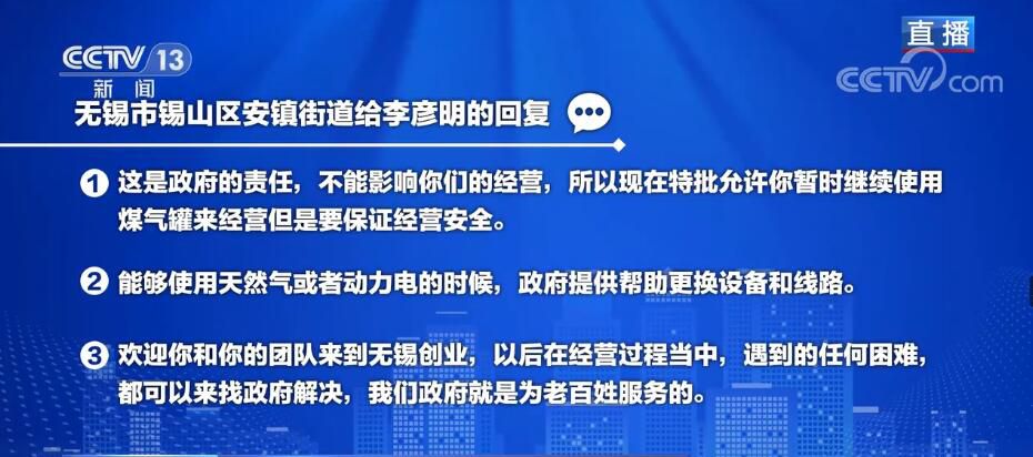 白岩松:首先我们来看看安镇街道给李彦明的回复当中的一些关键词,第一个,这是政府的责任,不能影响你们的经营。第二个里头包括能够使用天然气或者动力电的时候,政府提供帮助更换设备和线路。在第三里头有我们政府就是为老百姓服务的。咱们接下来马上连线一下当事人,无锡市锡山区安镇街道商务科的科长邹祎,就是他帮着办的这个事情。邹科长您好!您当然感受得到您火了,在网上也被网友表扬,我特别想知道您的领导表扬您没有?