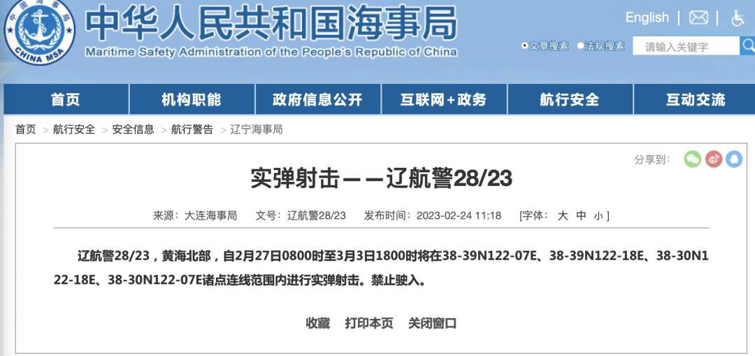 辽航警28/23,黄海北部,自2月27日0800时至3月3日1800时将在38-39N122-07E、38-39N122-18E、38-30N122-18E、38-30N122-07E诸点连线范围内进行实弹射击。禁止驶入。