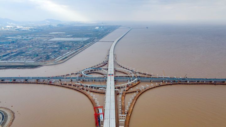 建设中的连接甬舟高速(舟山跨海大桥)和杭甬复线的滨海海上高速互通枢纽