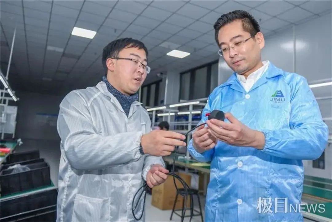 △韩道(右一)与孵化企业工程师交流产品研发进展(图片来源:极目新闻)