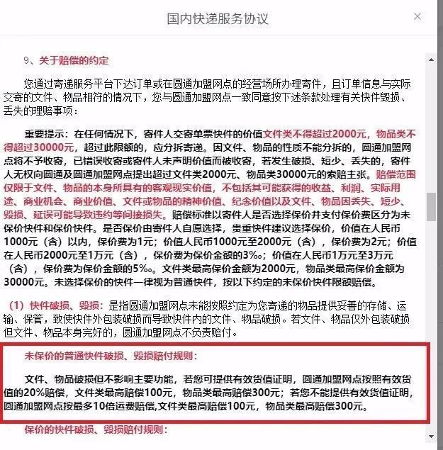 “文件、物品破损但不影响主要功能,若您可提供有效货值证明,圆通加盟网点按照有效货值的20%赔偿,文件类最高赔偿100元,物品类最高赔偿300元;若您不能提供有效货值证明,圆通加盟网点按最多10倍运费赔偿,文件类最高赔偿100元,物品类最高赔偿300元。”
