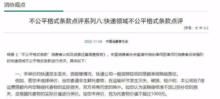 中消协点评的“未保价快递赔偿”不公平格式条款。