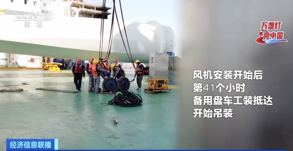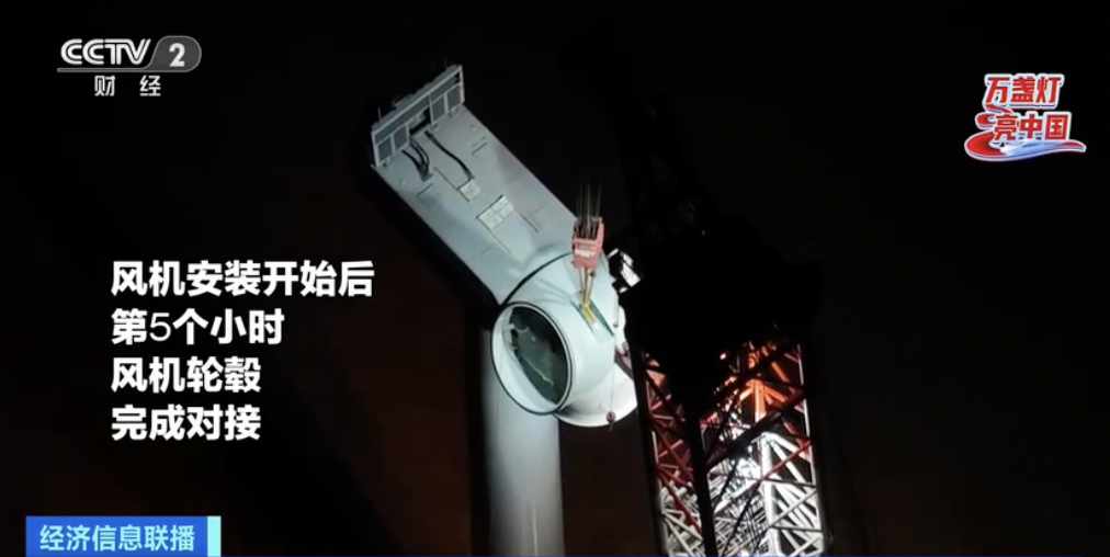 起重机会首先把100多吨的轮毂提升到高空,接下来,驾驶员会操控吊挂缆绳,不断调整轮毂的位置和角度。高空中,大风和惯性会让轮毂时不时出现晃动,甚至还会与机舱发生磕碰。好在这天晚上天气不错,凌晨时分,机舱和轮毂顺利对准,施工人员开始拧螺栓,把轮毂固定,以完成对接。