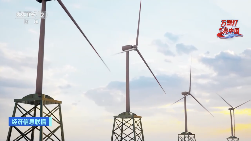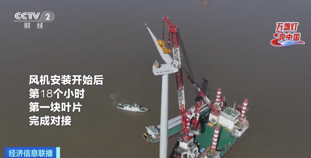 记者 张伟杰:浙江宁波外12海里的东海海域是一片特殊的工地——海上风电的安装施工现场。一艘海上风电施工船,伸出了四条腿,稳稳地站在了这片海域中,船上的打桩锤首先会把重达千吨的单桩,像钉钉子一样钉进海床中,紧接着海平面上风机塔筒会一节一节地竖起来,接下来起重机会把风力发电机的机舱和轮毂吊装到100多米的高空,叶片也将在高空和轮毂实现毫米级的精准对接。十多年前,我国首批海上风力发电机装机容量只有1.5兆瓦,叶轮直径大约在70米左右,如今,装机容量达16兆瓦,叶轮直径252米的风机即将在福建海域下海安装。到去年9月底,我国海上风电累计装机容量达到2726万千瓦,这个数字还在快速增长。强大的基建能力,在海平面竖起了一座又一座大风车,蔚蓝色的海风驱动着叶片,点亮了城市的万家灯火。