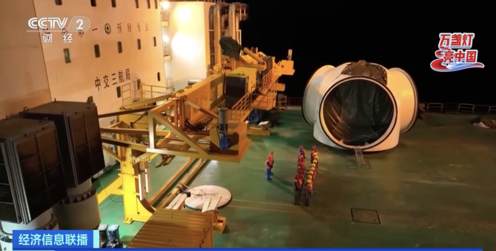 海面上不远处,一艘运输船,载着3节风机塔筒抵达预定点位,而这是海面上,将要点亮的,下一盏明灯。