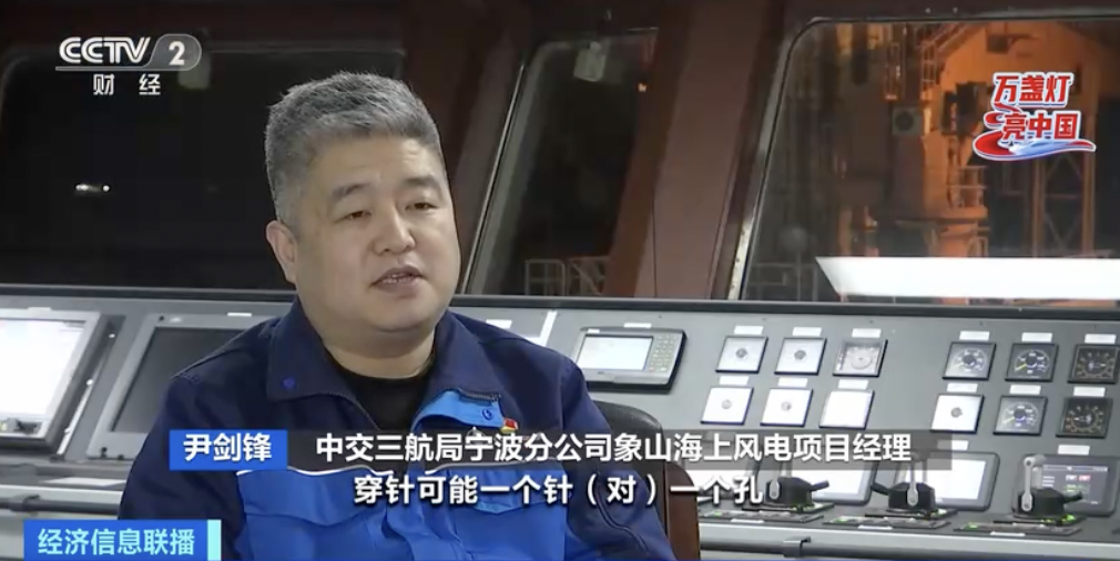 中交三航局宁波分公司象山海上风电项目经理 尹剑锋:叶片是平行对接的,对接的难度就更大。我们形容叫“百米高空穿针引线”,穿针可能一个针对一个孔,像我们这个孔多的达到一百七十几个孔,全部要对准,这个难度就可想而知。