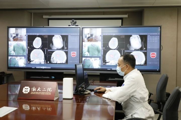 2021年6月,浙江大学附属第二医院医生在数字化神经外科空中手术室实施远程机器人辅助手术。(资料图)