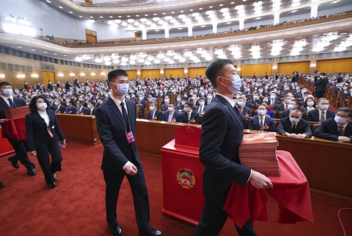 3月10日,全国政协十四届一次会议在北京人民大会堂举行第三次全体会议。这是工作人员准备发放选票。新华社
