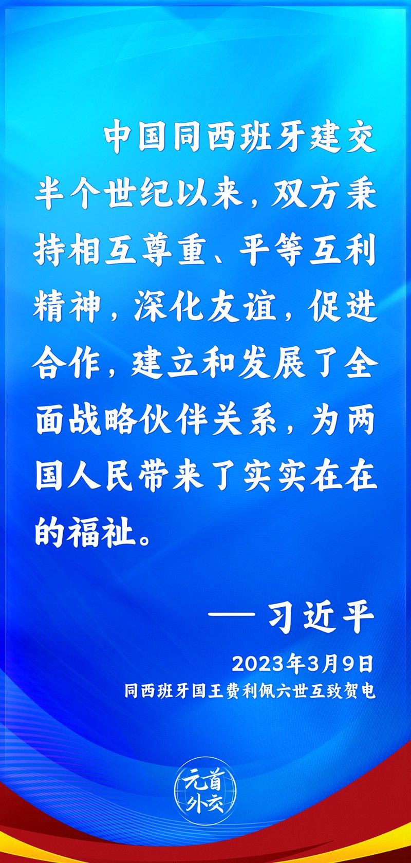 3月9日,国家主席习近平同西班牙国王费利佩六世互致贺电,庆祝两国建交50周年。