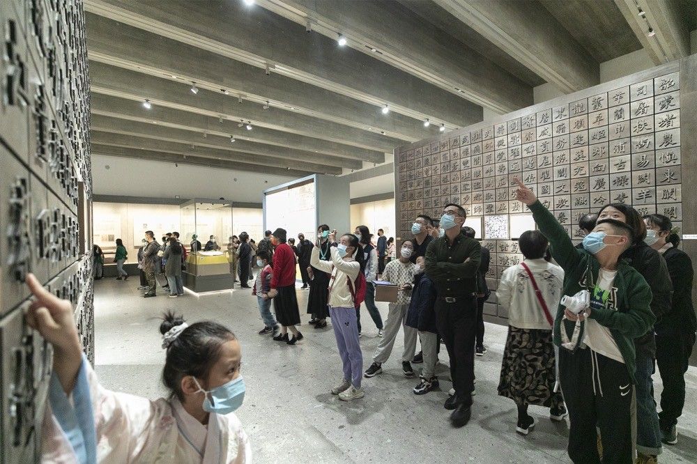 建筑领域国际最高奖项“普利兹克奖”的首位中国获得者王澍老师是版本馆的主创建筑师。现代建筑语言和宋代园林神韵的碰撞,收获了网友们“随手一拍都好看”“高级”“出片”等如潮好评。“网红机位”青瓷屏扇门以瓷仿玉、大气铺陈,在阳光的映射下清澈透亮,在光影的流动中仿佛携缕缕宋韵风华踏美而来,将简约与灵动之美诠释得淋漓尽致。在一片梅子青前拍个照、打个卡,是许多观众进馆后的必选项目。一张张美景美图通过社交媒体飞速传播,为版本馆“出圈”添了把火。随着版本文化进入更多人的视野,丰富的展览展陈和数字化场景随之成了版本馆走红的“加分项”。在各具特色的展览中,不同专业背景、各个年龄阶段的观众都能在这里找到共鸣。珍贵的商周青铜器、唐写经、宋刻精品满足了古籍版本、金石专家的胃口;印刷出版行家流连于清代雕版、各类活字、近代石印版、七八十年代的印刷工具;“生活中的版本”牵动着老人们的回忆,他们在展台前感慨人民币版本的变迁,聊起用一分钱纸币折菠萝的往昔记忆;而年轻人则更多沉浸于互动区和数字馆带来的新奇体验。