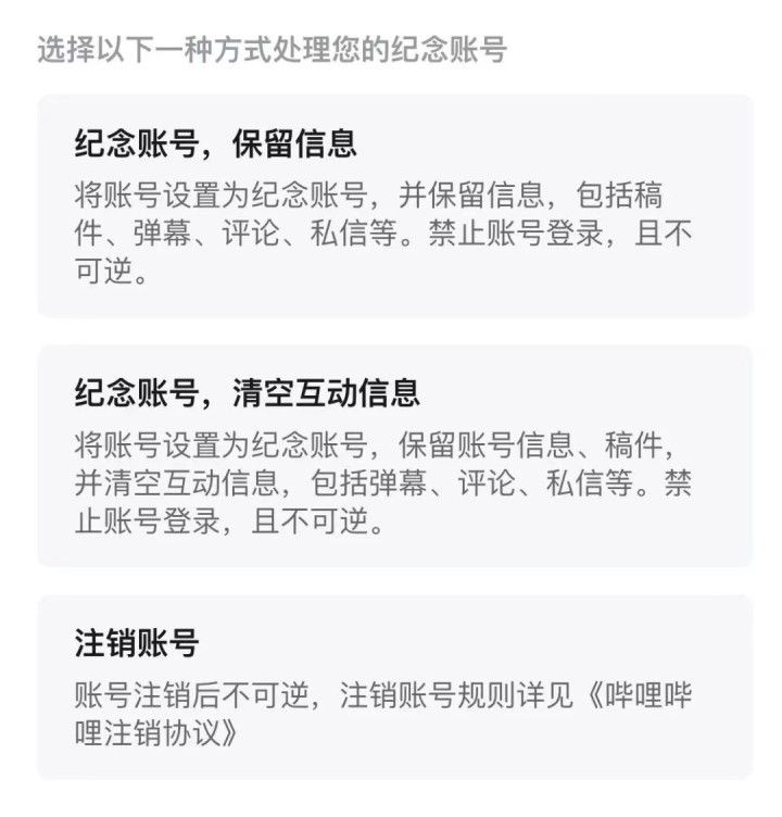 一个人去世后,他的B站账号会怎样?在B站去年最新上线纪念账号功能里,给了每个人三种选择——留下全部的信息痕迹、保留账号内容删去自己的其他评论和弹幕足迹、以及一键清空。