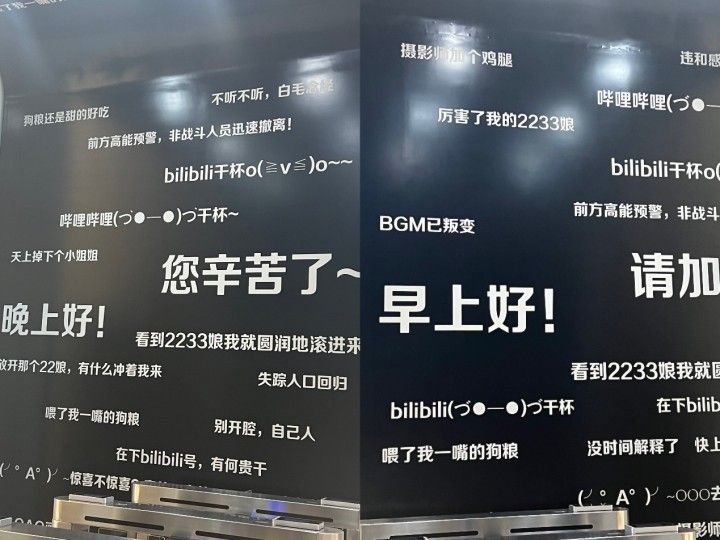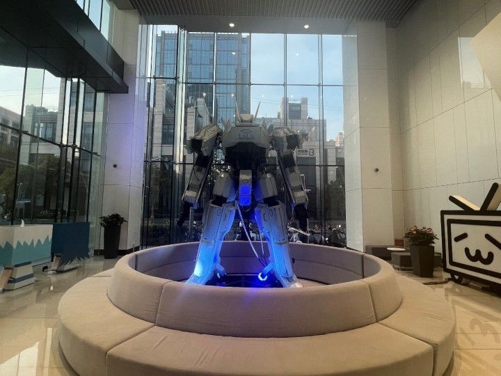 走进B站的其中一幢大楼,一个巨型的高达就放在公司入口左边最显眼的位置。电视大屏滚动播放着知名UP主的视频,入口处被装成了一个巨大的电视,再往里走,经过两排印在左右两侧巨大的弹幕,才能到达等待电梯的区域。