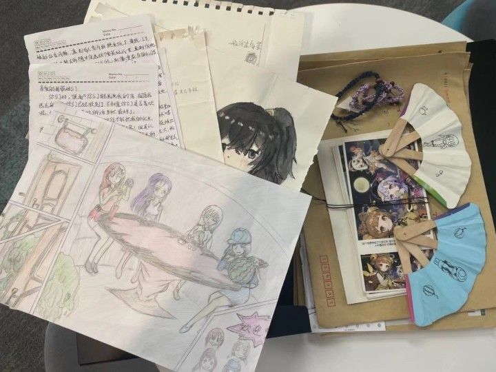 B站的能量加油站小组收藏着一组特殊的礼物,里面有自制的小扇子、成捆的明信片、牛皮纸包着的手写信等等。